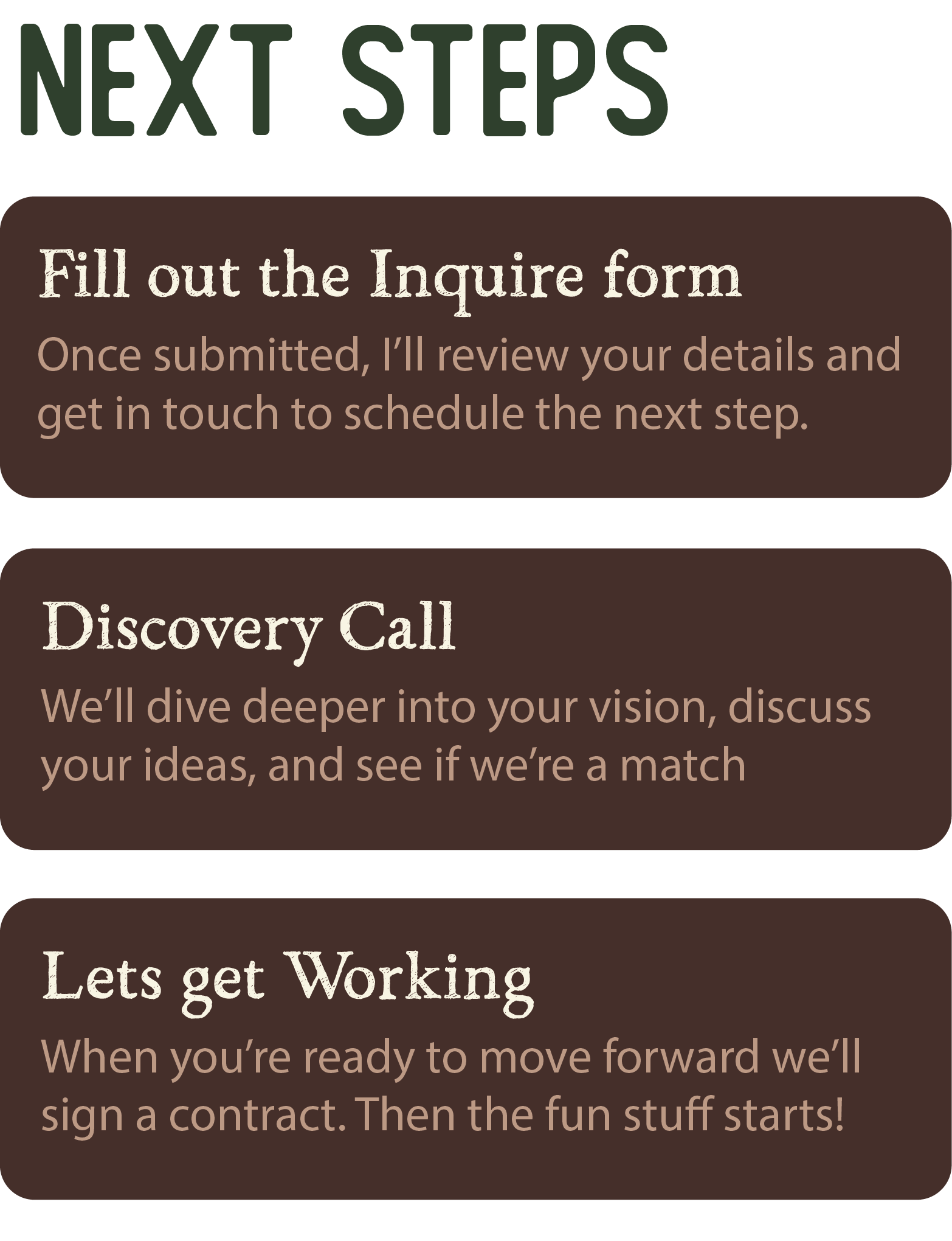 Your voice and actions have gotten you this far, but your lack of cohesive visuals are holding you back now and it’s slowing down your growth, opportunities, and momentum by not sharing who you are cohesively. When you’re ready to further your impact let’s make sure your visuals further your mission!