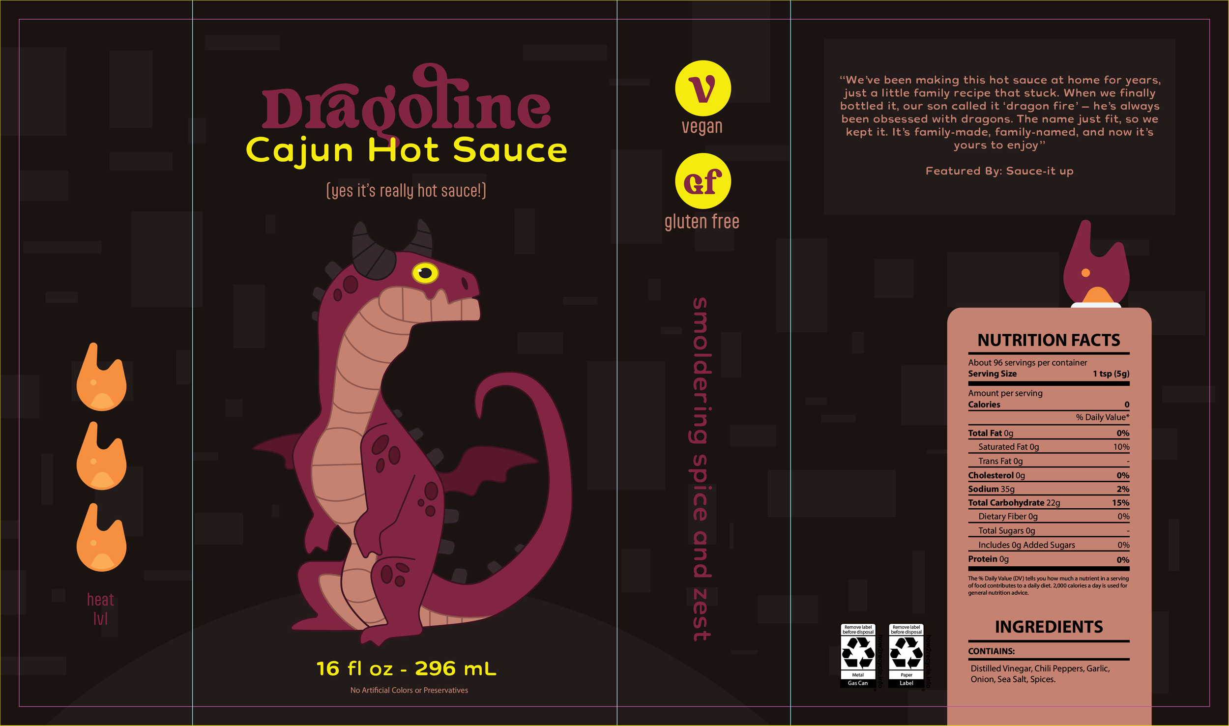 Dragoline hot sauce is gluten-free, vegan, and made with just a handful of clean ingredients: chili peppers, garlic, onion, vinegar, and spices.What started as homemade batches for friends and family has grown into a brand built on connection, tradition, and a touch of fire.