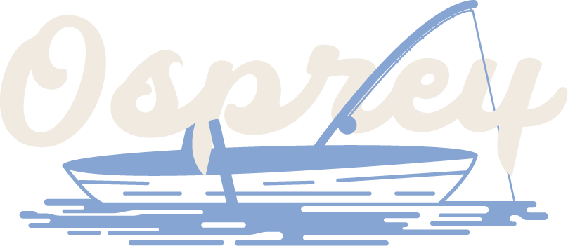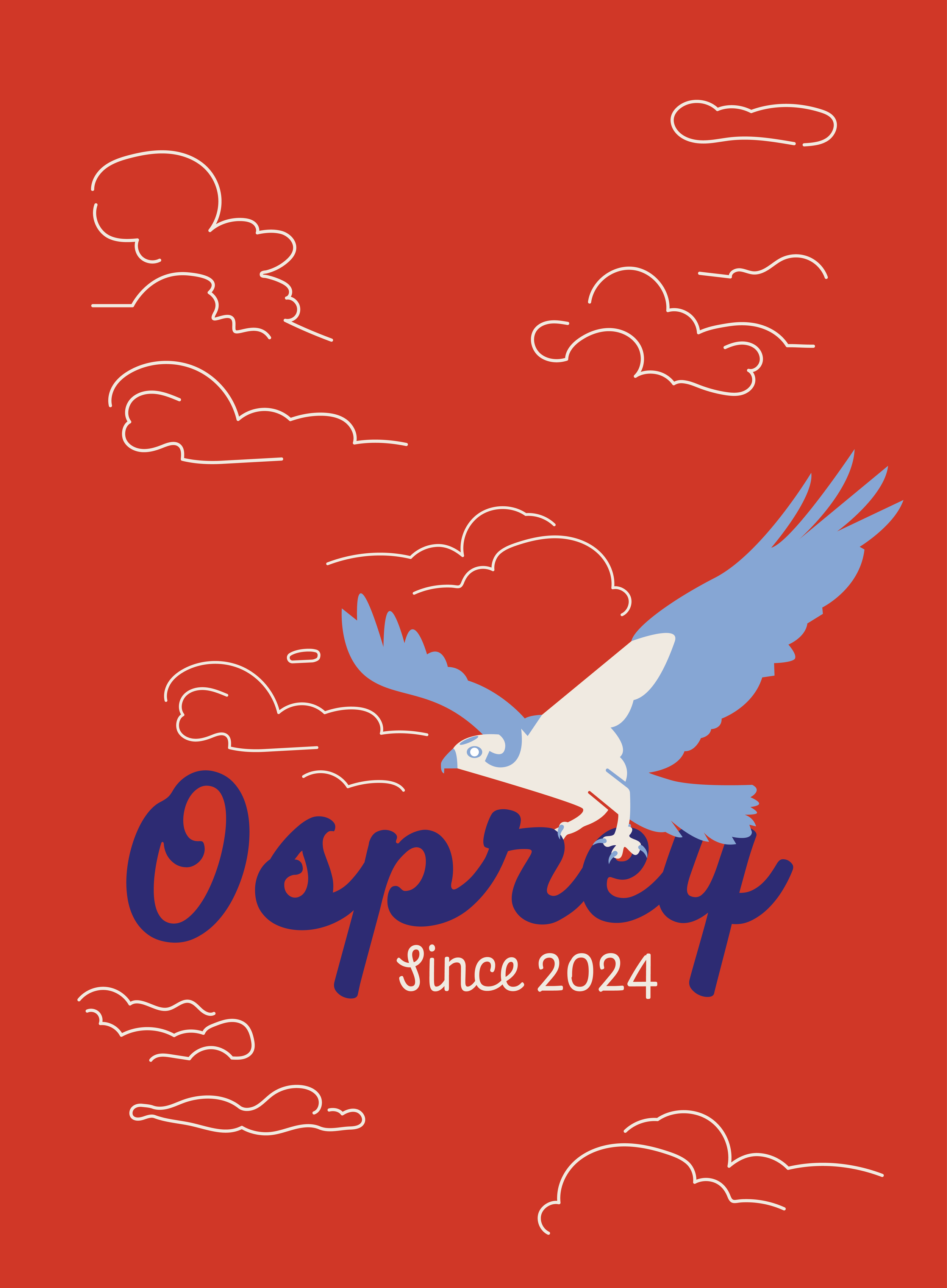 For the brand we wanted bright and ship-like. Our inspiration was taken from the sea and a style that feels like a classic steam boat that delivered up and down rivers. We added a simple boat on the waves for fishing and a sense of serenity. And of course we have our osprey as the main illustrated logo along with some fish as complimentary illustrations! Using a line art style we created clouds and stamp lines that both contrast with the main illustration style and bring it all together by making a strong background that doesn’t take away from the main focus and matches our secondary font.